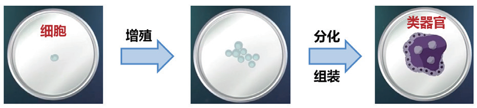 类器官是指利用细胞进行体外三维培养而形成的具有一定空间结构的组织类似物。尽管类器官并不是真正意义上的器官,但它可以在结构和功能上模拟真实器官,最大程度地模拟体内组织结构及功能并能够长期稳定培养。图2为类器官培育示意图,细胞经过增殖、分化、组装形成微小的组织,即类器官。其中,细胞可以自发组装,也可以借助外部人为干预(如3D生物打印等)实现组装。