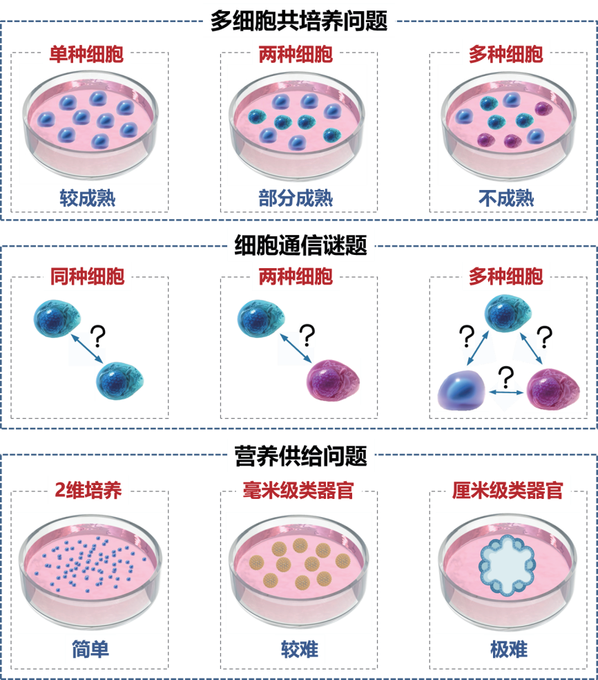 多细胞共培养问题 我们人体的各个器官都是由多种细胞组成的,这些细胞和谐相处、共同维系着器官的正常功能,某种细胞的病变或缺失将造成器官功能的紊乱。因此,成熟的类器官一定是多种细胞的组合体。但是,与体内环境不同,体外细胞培养依赖特定的培养基和生长因子,培养不同细胞所需的培养基和生长因子各有差异。目前,单种细胞的培养已经较为成熟,基于单种细胞的类器官培养也是当下的研究主流;两种细胞的共培养需筛选兼容两种细胞的培养条件,近年来也获得了长足的进展,两种细胞组合的类器官也相继问世;对于多种细胞共培养,难度进一步升级,需探索适合多种细胞生长发育的培养条件,也只有克服多细胞共培养问题,才能构建出成熟的类器官。