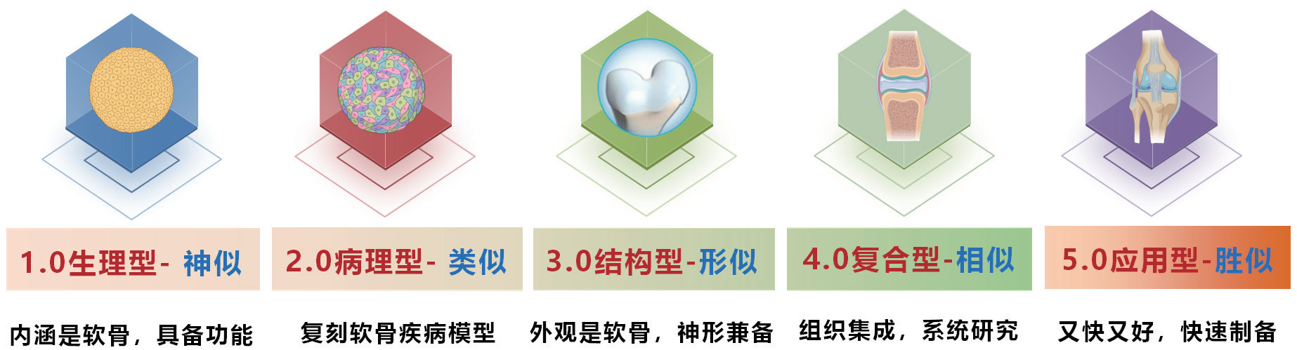 实现类器官的高阶研究,需要新武器的加持。首先,在理论方面,我们团队的首席科学家刘昌胜院士,于2017年在《化学评论》(Chemical Reviews)首次提出了材料生物学理论,该理论旨在聚焦生物材料在介导生命活动中的作用规律,探究材料的细胞响应、组织形成、免疫特征、微环境调控等行为,认清活性分子、材料特性、力学刺激等产生的特定生物学效应,在细胞、组织/器官及整个生物体等不同层面揭示材料特征对其生物学功能的影响及其调控规律,建立材料特性与生物功能的关联性,这为材料的设计和新功能挖掘提供了理论支持。其次,在技术层面,人工智能(AI)技术是目前最火的技术,借助AI大数据分析,不但可以辅助我们做出筛选和决策,提高我们的研发速度,随着海量数据的挖掘,它还可以帮助我们提升研发的准确率。基于上海大学“自强5000”超级计算平台构建,依托千卡GPU加速卡等算力,经过数万层数据标注和上千小时训练,我们团队发布了全球首个专注于类器官研究的垂直大模型——Organoids-GPT(O-GPT,http://great.shu.edu.cn:2335/)。O-GPT的发布,实现了业内领先的类器官领域问题解答能力,填补了类器官领域在垂直大模型应用中的空白,为研究人员提供了智能化的知识支持和高效的研究工具。我们团队关于软骨类器官的研究愿景是:基于材料生物学理论,结合AI技术,破解软骨类器官构建瓶颈,分阶段实现生理型(1.0神似)、病理型(2.0类似)、结构型(3.0形似)、复合型(4.0相似)和应用型(5.0胜似),系统性揭示软骨疾病新机制,突破软骨类器官快速制备与应用转化(图5)。