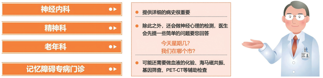 在专病门诊,医生会详细询问病史,根据患者情况安排神经心理测评,比如记忆力、计算力、执行功能、注意力、语言功能以及绘图功能等小测验,从而得到一个认知功能的量化评价。同时完善相关辅助检查,如血常规、肝肾功能、甲状腺功能、维生素测定、痴呆相关的基因筛查、海马磁共振等,现在也可以通过正电子发射断层显像-计算机断层显像(PET-CT)的手段来评价大脑中淀粉样斑块和tau 蛋白的情况。鉴别认知障碍的类型,明确病情的严重性,找准病因,才能对症下药。