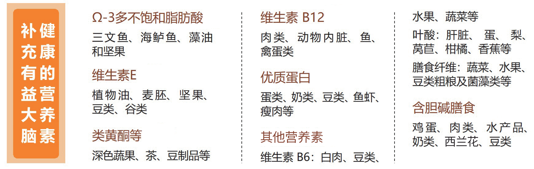 首先是 “吃”,也是一种“食补”,大脑更需要来自食物的能量。我们推荐地中海饮食、得舒(DASH)饮食、健脑(MIND)饮食等,我们认为它们有助于改善和提高认知障碍患者躯体功能和营养状况。“地中海饮食”提倡多吃蔬菜、水果、鱼、海鲜、豆类、坚果类和谷类食物,且烹饪时用植物油代替动物油,尤其提倡用橄榄油 。DASH饮食旨在预防和控制高血压,推荐高钾、高镁、高钙和低钠的食物选择。提倡多摄入蔬菜、水果和低脂乳制品等,限制摄入饱和脂肪与糖分。MIND饮食是将前两者结合起来,建议多吃绿叶蔬菜、坚果、豆类、全谷类、鱼类和禽类食品,用橄榄油烹饪食品,并限制食用红肉、黄油、奶酪、油炸食品以及快餐等食品。此外,大家可以在生活中多挑选“益脑食物”。