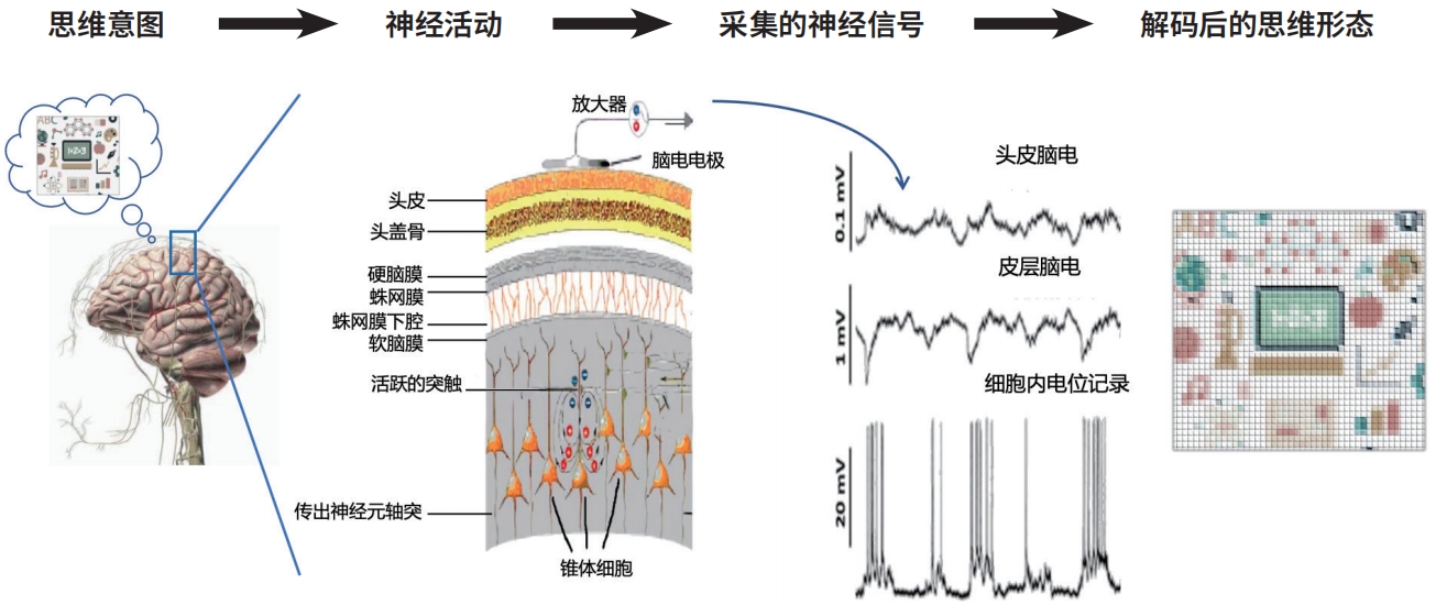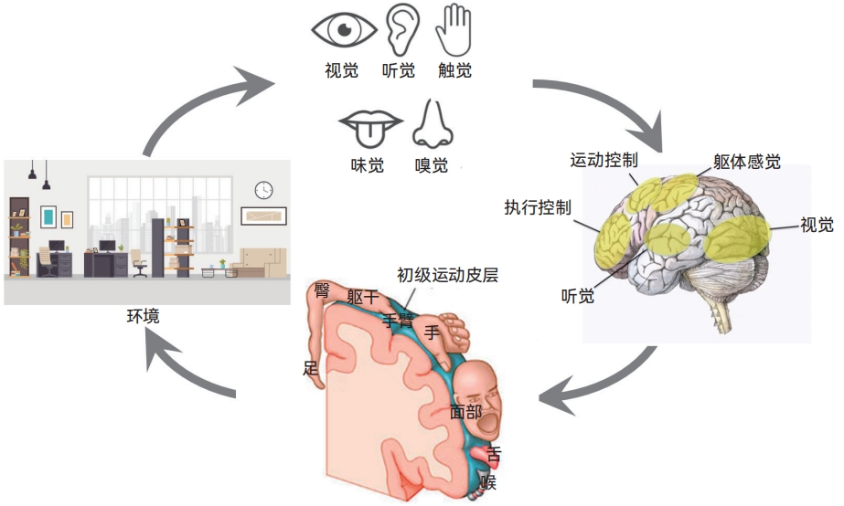 人类与环境交互是一个闭环双向的过程,这一过程的核心是人脑处理感知、控制和运动输出等多种功能(图1)。首先,感知功能是指大脑如何接收和解读来自我们五官感觉(视觉、听觉、触觉、味觉和嗅觉)的信息。这些信息通过相应的感受器官收集后,转换为神经信号,通过神经元传递到大脑的不同区域进行处理和解读。其次,控制功能涉及大脑如何基于接收到的信息和已有的记忆或知识,做出决策并指挥身体作出反应。这包括日常的自主活动,如呼吸和心跳,以及更为复杂的情感表达和思考过程。大脑的前额叶尤其在这方面起着核心的调控作用,负责高级认知功能如解决问题、规划和执行决策等。最后,运动输出功能是大脑如何指挥身体的运动。这主要由大脑的运动皮层控制,该区域生成关于身体运动的指令,通过神经系统传递到肌肉,引起相应的动作,其中不同躯体位置的运动控制对应不同的皮层区域。这三个功能——感知、控制和运动输出——共同使得大脑能够有效地与外界环境交互,支持我们的日常活动和复杂的行为表现。