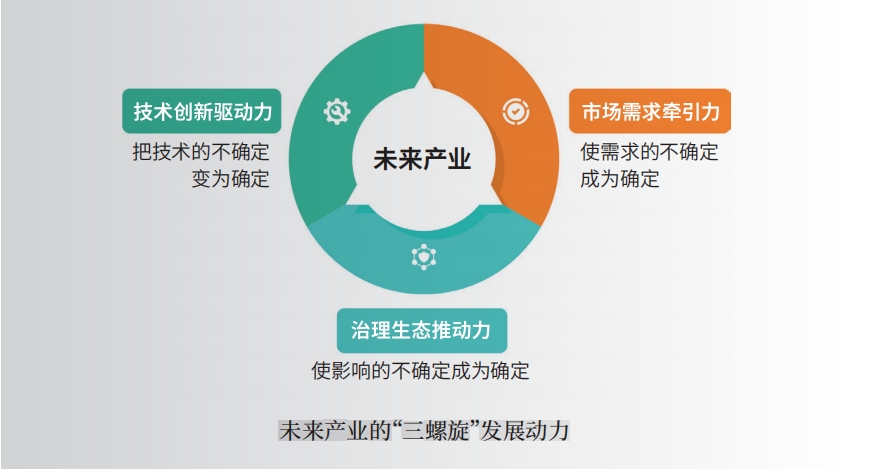 未来产业源于科技创新和产业创新的深度融合。关于培育和发展未来产业,学界和业界达成的一个共识是:技术创新驱动力、市场需求牵引力、治理生态推动力三者共同构成未来产业的“三螺旋”发展动力。其中,前沿和颠覆性技术创新是未来产业的核心驱动力;市场需求的牵引是未来产业价值实现的关键;政策制度与社会文化则是未来产业健康发展的重要支撑和催化剂。推动未来产业发展,技术、市场、治理三种力量缺一不可,但它们发挥作用的逻辑机理各有不同。