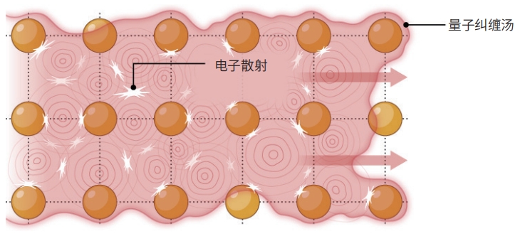 奇异金属电阻率 奇异金属的电阻率实在太高,电子似乎就像是在真空中散射一样。取而代之的是,携带电荷的可能是形成量子纠缠的粒子汤,甚至根本没有粒子