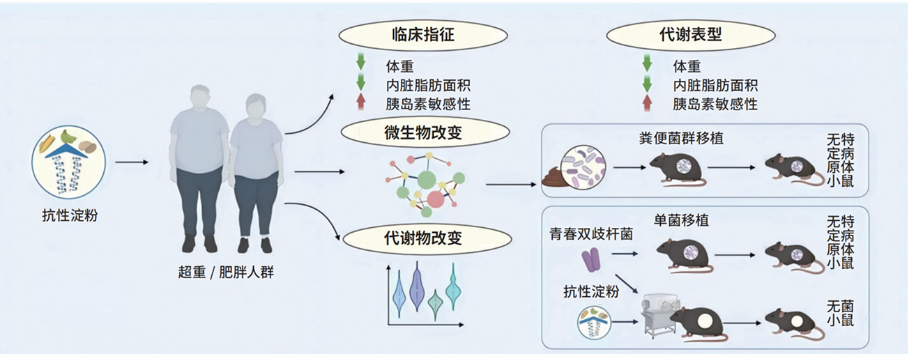抗性淀粉与减重:肠道菌群的“大调控” 肥胖是一种全球慢性疾病。根据世界肥胖联合会发布的《2025世界肥胖地图》的报告,2025年中国成年人口中,超重[身体质量指数(BMI)≥25千克/米2]和肥胖(BMI≥30千克/米2)率将分别达到41%和9%。相关数据显示,全球肥胖成年人口将从2010年的5.24亿激增至2030年的11.3亿,增幅高达116%,这将显著增加2型糖尿病、心血管疾病等慢性病的患病风险,已构成全球公共健康危机。基于过往研究中报道的抗性淀粉的代谢益处,我们希望能进一步探索抗性淀粉是否对超重和肥胖人群具有长期稳定的有益影响,以帮助减轻这类代谢性问题带来的疾病负担。